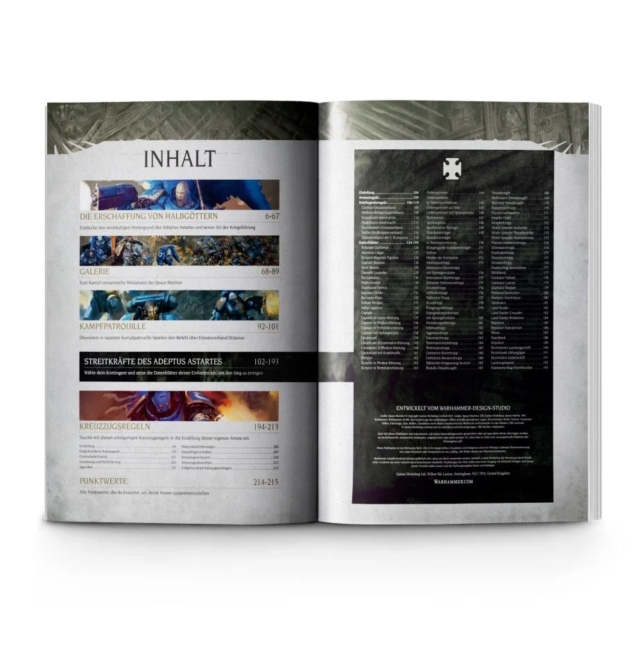 – 93 Datenkarten, die Profile, Ausrüstung und einzigartige Fähigkeiten für jeden Einheit der Space Marines aufführen, von den frisch rekrutierten Scouts bis zu den mächtigen Dreadnoughts