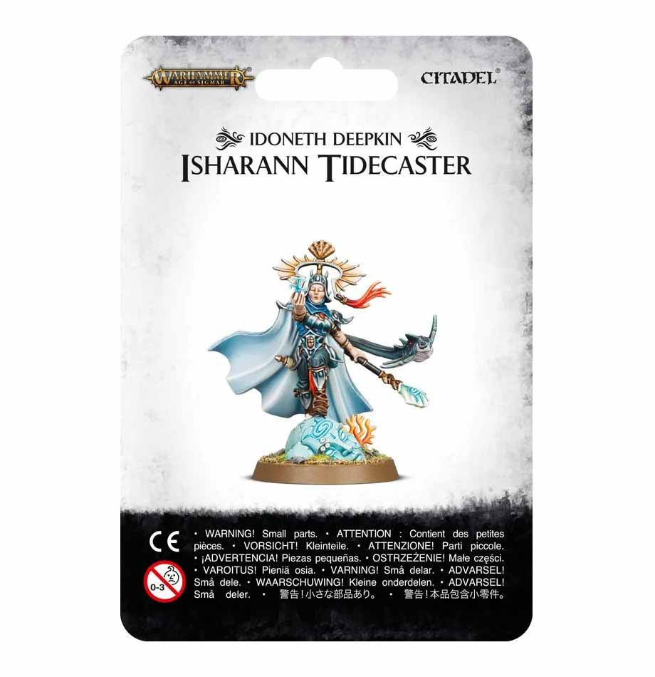 Dieser mehrteilige Bausatz aus Kunststoff enthält alle nötigen Bauteile zum Zusammenbau eines Isharann Tidecasters. Sie steht auf einer großen, gefallenen Aelf-Ruine (der Kopf einer Statue mit einer in die Stirn gemeißelten Rune) und ist wie eine Zauberin positioniert, die gerade etwas äußerst Finsteres heraufbeschwört – ihre Augen sind geschlossen und in der rechten Hand hält sie eine Rune umklammert (die Aelf-Rune für Wasser, die auf die Schleiersee hinweist, die ihren Befehlen gehorcht). Sie ist in Metallrüstung gekleidet und ihre stachligen Schulterpanzer halten den Umhang, der hinter ihr wallt. Über ihrem Kopf ist eine Flossenkrone auf ihrem Helm befestigt, die in der Mitte eine Muschel zeigt. Ihr Status als Magierin wird von einigen Schriftrollen und Tränken untermauert, die an ihrem Gürtel hängen. Sie ist mit einem Pelagic Staff bewaffnet, und ein Spirit Guardian schwimmt um sie herum, um sie vor Schaden zu bewahren.