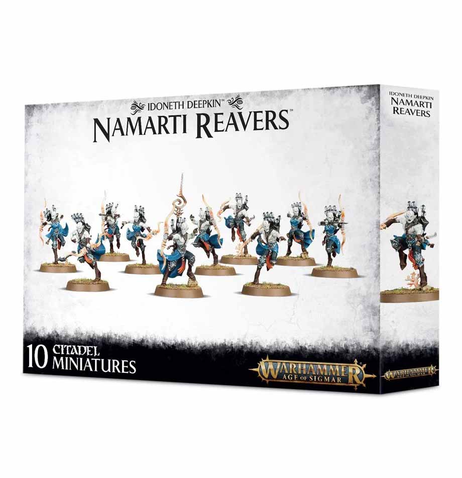 Die Namarti Reavers stellen die Schützen und Kundschafter Phalangen der Idoneth Deepkin. Die Akhelians erkennen den taktischen Bedarf an Aufklärungseinsätzen, Feldwachen und massiertem Beschuss an, doch sie betrachten solche Pflichten als unter ihrer Würde. Daher werden die Reavers aus den geschicktesten und schnellsten Namarti rekrutiert. Ihre Ausbildung an der Waffe konzentriert sich auf das schnelle Zielen und das Abfeuern des lautlosen Whisperbows sowie die Selbstverteidigung mit den kurzen Keening Blades, die fürs Zustechen entwickelt wurden. Im Kampf bewegen sich die Namarti Reavers schnell, prüfen die Verteidigung des Gegners, machen verletzliche Beute aus und verwüsten die wichtigsten Befestigungen des Feindes. Mit tödlichen Salven lenken die Namarti Reavers ihre Widersacher ab und ziehen die Aufmerksamkeit der gegnerischen Truppen auf sich, noch während die Akhelians sich bereits für ihren vernichtenden Angriff versammeln.
