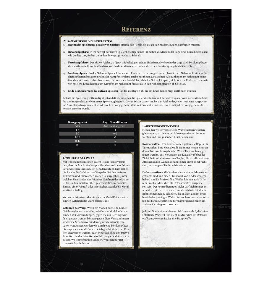 – Grundregeln: Du lernst alles über die allgemeinen Spielprinzipien, seine Züge und Phasen, wie du deine Einheiten befehligst, Entfernungen misst, auf Feinde schießt und in den Nahkampf stürmst. Du lernst auch alles über Reaktionen, die es jedem Spieler erlauben, auf die sich zutragenden Ereignisse zu reagieren, auch wenn er nicht am Zug ist.